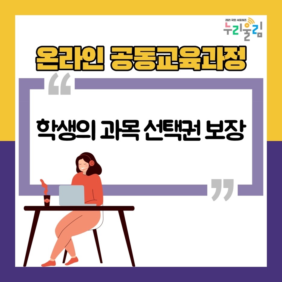 교육부는 17개 시‧도교육청과 함께 2017년부터 온라인 공동교육과정을 통해 학교에서 개설되지 않는 과목을 들을 수 있게 도와주고 있습니다. 또한, 학생 개개인의 진로와 적성에 맞는 교육과정을 제공함으로써 학생들의 과목 선택권을 보장하고, 공간의 제약을 받지 않게끔 온라인을 통해 교육받을 기회를 제공하고 있는데요. 어떻게 이루어지고 있는지 한 번 살펴볼까요?