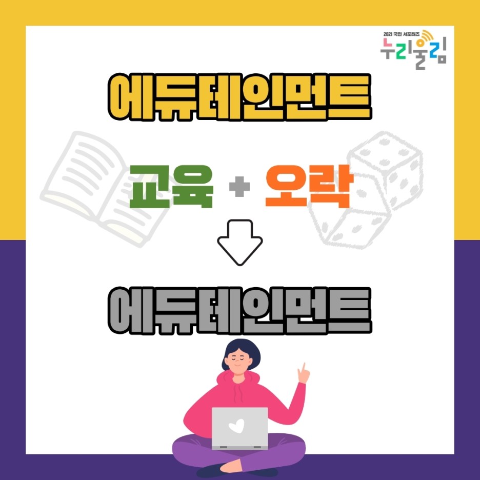 에듀테인먼트란, 교육과 오락의 합성어로서, 게임을 통해 학습을 이끌어내는 수업방식입니다. 학습에 흥미가 떨어지는 학생들이 있다면, 에듀테인먼트를 통해 교육에 ‘재미’를 더 추가하여 학습자의 학습 동기를 이끌어낼 수 있다는 것이 에듀테인먼트인데요. 실제로 교육 현장에서는 이런 에듀테인먼트를 활용하기 시작하였습니다. 현대의 교실에서는 축구를 진행 시키기 위해 사칙연산을 활용해야 하는 ‘암산 축구’와 같은 게임, VR을 통해 역사적인 곳을 눈으로 직접 마주할 수 있는 ‘VR 역사 프로그램’과 같은 에듀테인먼트가 시도되고 있습니다.