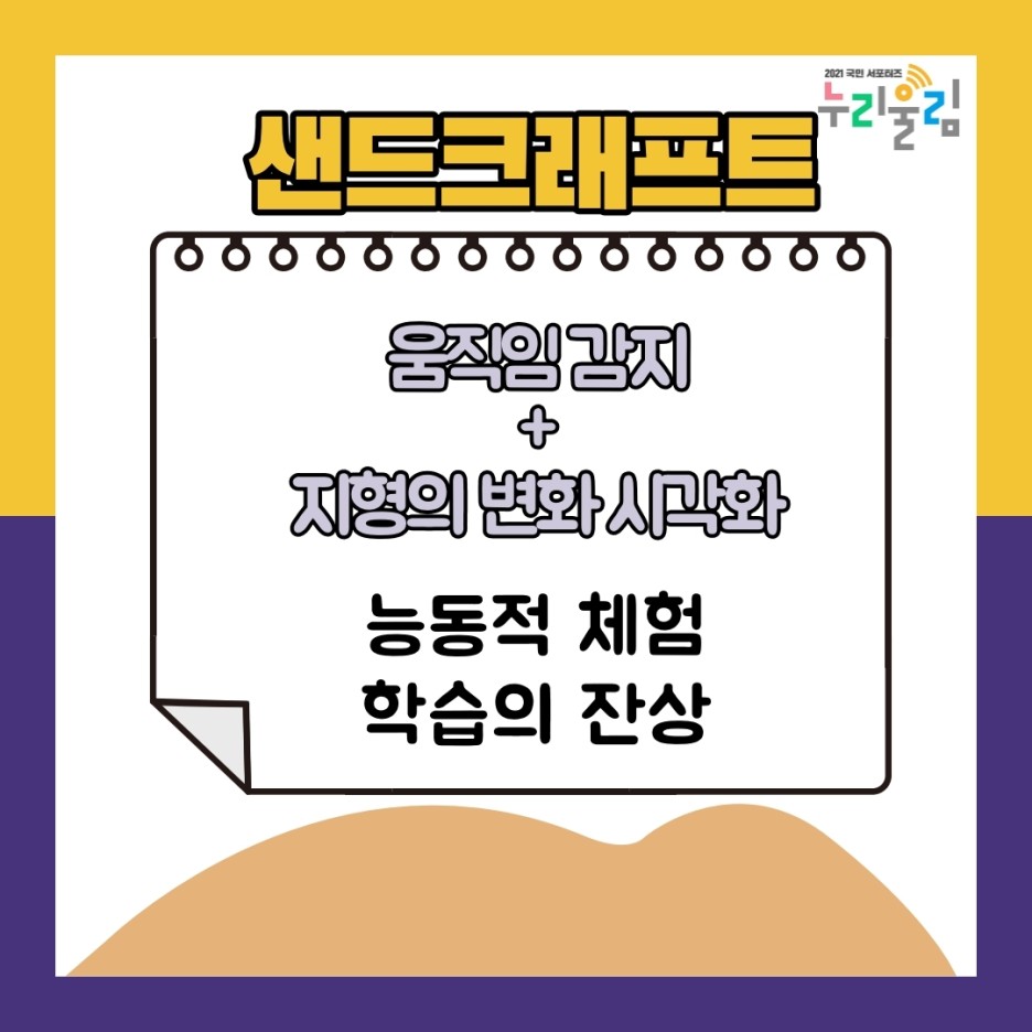 에듀테인먼트의 예로 ‘샌드크래프트’라는 교육 콘텐츠를 소개해드릴게요. 샌드크래프트는 학생이 모래를 만지는 움직임을 감지하여 지형의 변화를 시각적으로 보여주는 에듀테인먼트 수업방식 중 하나입니다. 이를 통해 학생은 촉각과 시각을 통해 교육을 받을 수 있고, 학습의 잔상이 머릿속에 더 오래 남을 수 있게 됩니다. 실제로 성남시에 샌드크래프트를 체험할 수 있는 부스가 마련되어 있으며 신청을 통해 체험이 이뤄지고 있다고 합니다.