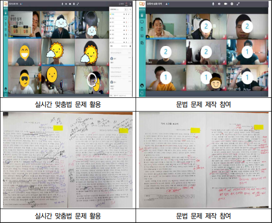실시간으로 학생들과 교사가 상호 작용하며 문제를 제작·활용하는 모습입니다. 이처럼 따로 판서를 사용하지 않더라도, 필기하는 모습을 공유하여 학생들에게 보여줄 수 있습니다. 또한, 학생들은 서로의 모습을 서로 보며 소통할 수 있고, 위의 사진처럼 교실온닷에서 제공되는 스티커를 통해 자신의 의견을 반영할 수 있습니다. 이렇게 교실온닷의 양방향 소통 시스템을 이용한다면, 비대면일지라도 실제로 교실에 있는 듯한 느낌을 받을 수 있습니다.