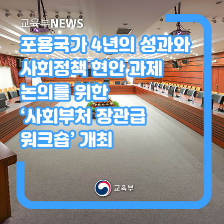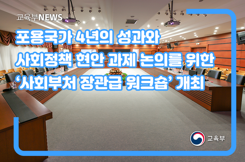 유은혜 부총리 겸 교육부장관은 국무총리, 사회부처 관계장관과 청와대 정책실장 등이 참석하는 ‘사회부처 장관급 워크숍’을 3월 27일(토) 국가공무원인재개발원 분원(경기도 과천 소재)에서 개최한다.