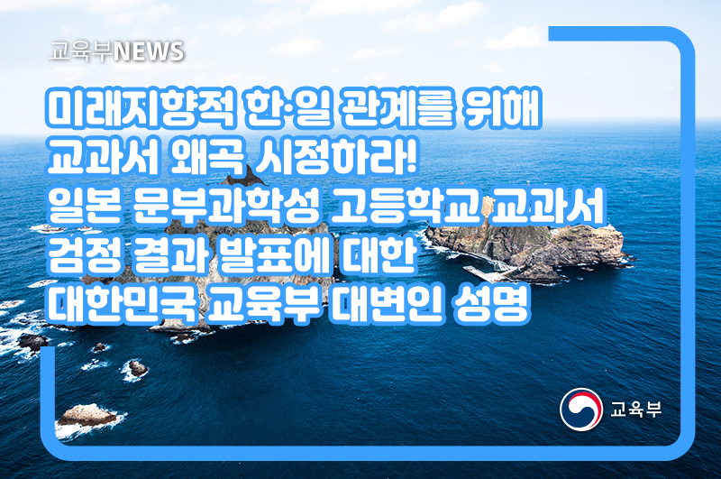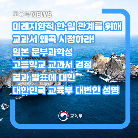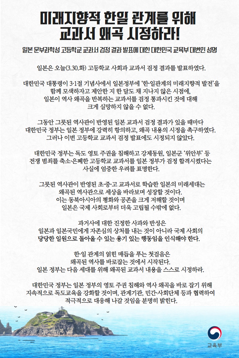 미래지향적 한·일 관계를 위해 교과서 왜곡 시정하라! 일본 문부과학성 고등학교 교과서 검정 결과 발표에 대한 대한민국 교육부 대변인 성명