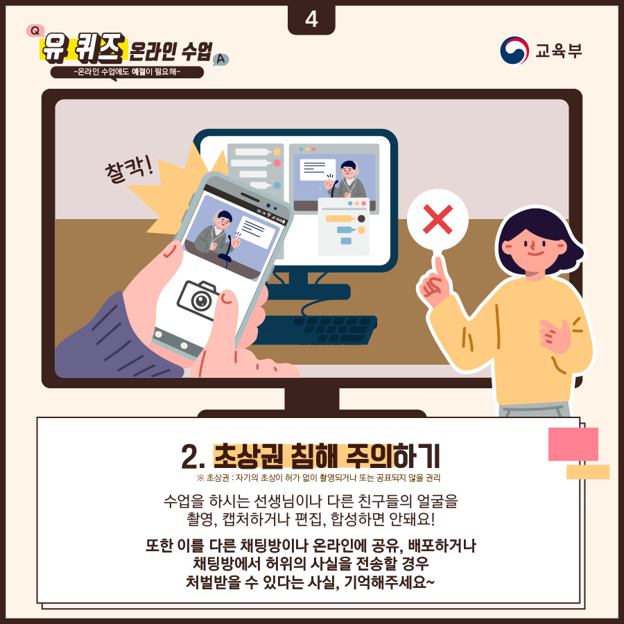 ✔ 수업을 하시는 선생님이나 다른 친구들의 얼굴을 촬영, 캡처하거나 편집, 합성하면 안돼요!