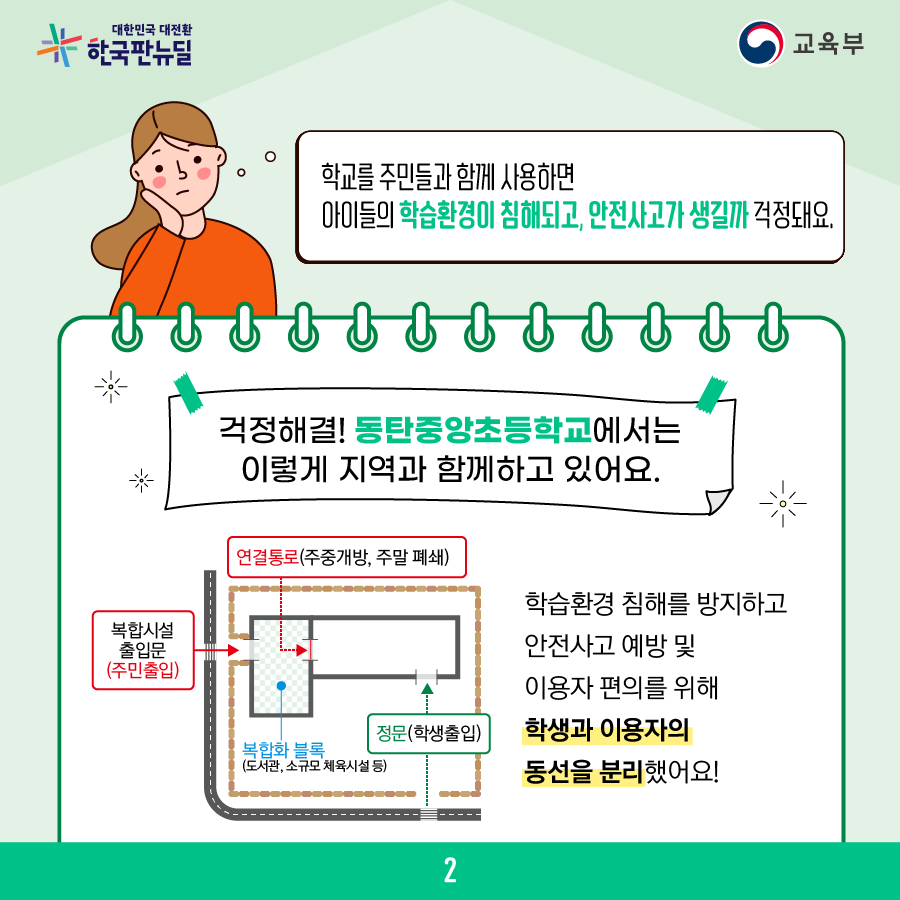학교를 주민들과 함께 사용하면 아이들의 학습환경이 침해되고, 안전사고가 생길까 걱정돼요.