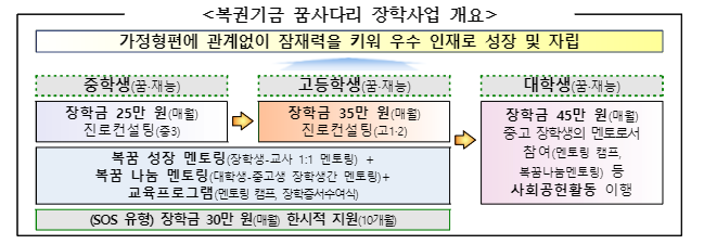 ‘복권기금 꿈사다리 장학사업’은 역량과 잠재력을 갖춘 저소득층 중‧고생을 선발하여, 대학까지 연계 지원하는 국가 장학사업으로,