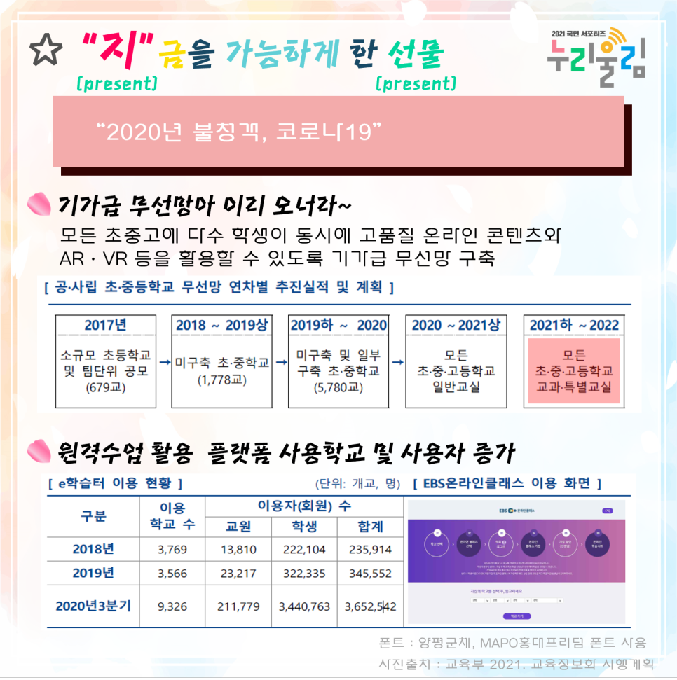 특히, ‘학교 무선망 구축’ 사업은 차세대 무선망 기술 표준인 ‘와이파이-6’ 기반의 무선 공유기(AP)를 설치합니다. 2021학년도 상반기까지 전국 모든 초·중·고교 교실에 기가급 무선환경을 구축할 예정이라고 하니 더욱 ‘두근두근’거립니다. 원격수업에서 다양한 플랫폼을 활용한 실시간 수업을 진행할 수 있으며, 등교수업 시 여러 학생이 동시에 무선망과 스마트 기기를 사용하더라도 빠른 속도로 이용할 수 있었습니다. 특히, 가상현실(VR)․증강현실(AR) 활용한 미래 교육이 확대된다는 점에서 앞으로 학생들의 등굣길 발걸음이 점점 즐거워질 것 같습니다.