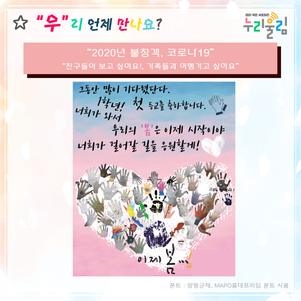 2020학년 갑작스레 찾아온 불청객, 코로나19를 마주한 우리 학교의 풍경은 어떻게 변했을까요? 3월 벚꽃과 함께 까랑까랑한 목소리로 등굣길을 밝혀야 할 아이들은 각자의 집에서 깊은 한숨을 내쉬어야만 했습니다. 각자의 집에서 저마다의 소원을 담은 손도장을 찍어 보내는 일 밖에는 새 학기를 맞이하였다는 사실을 크게 느끼지 못했습니다.