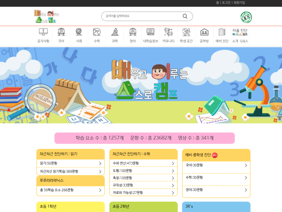배·이·스·캠프 비상업적 교육용 무료사이트를 소개합니다! 배우고 이루는 스스로 캠프라는 명칭을 가진 배·이·스·캠프는 기초학력진단-보정 시스템과 자매 사이트로 자율진단이 가능한 플랫폼입니다. 교육부, 17개 시·도교육청이 지원하고 충남대학교 응용 교육측정평가연구소에서 콘텐츠 개발 및 관리를 담당하고 있습니다.