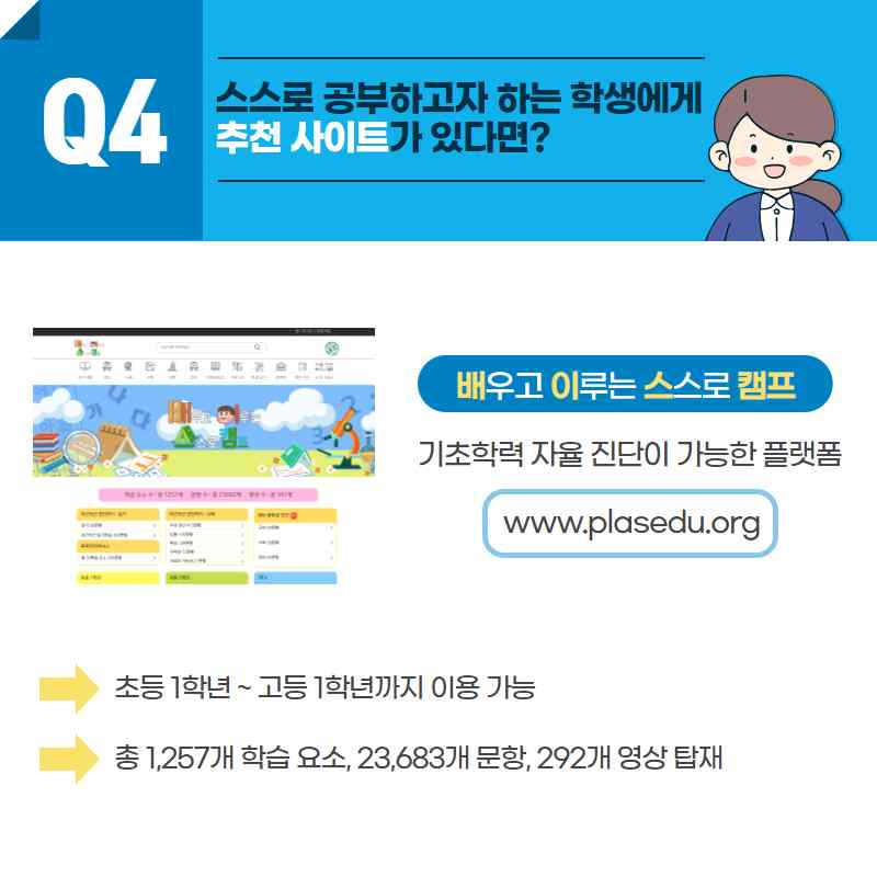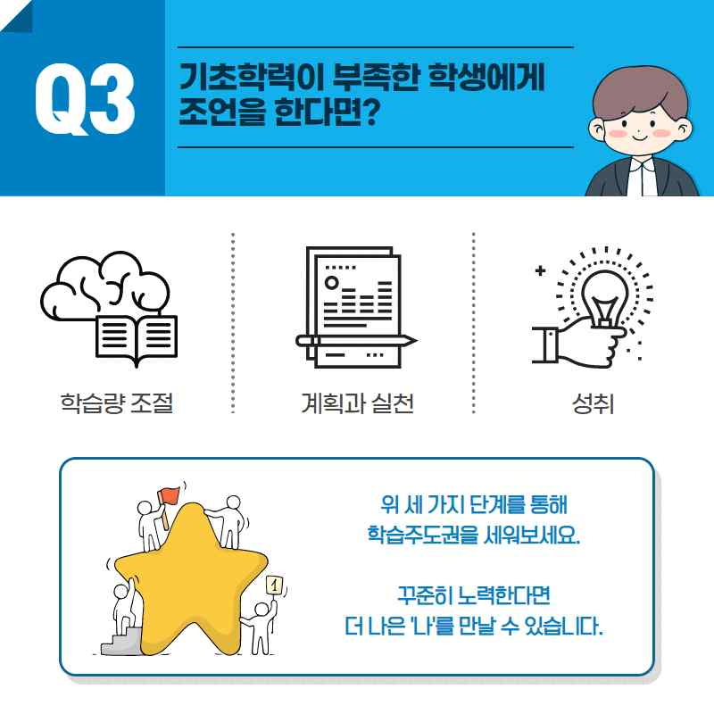 Q. 기초학력 부족 학생 또는 현재 공부를 함에 있어서 어려움을 느끼는 학생들에게 조언이나 말씀 부탁드립니다.