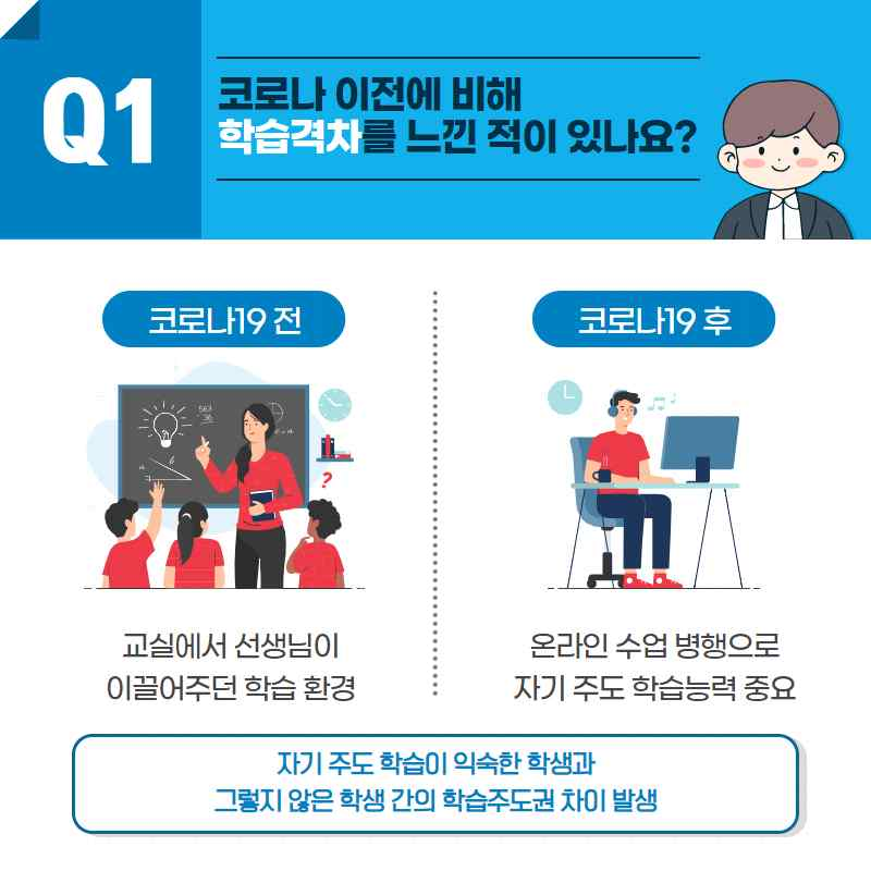 A. 작년은 코로나19로 인해 온라인 수업이 등교 수업보다 많았던 한 해였습니다. 이전에는 물리적인 교실에서 선생님께서 학습을 이끌어주셨다면 온라인 수업은 자기주도적인 학습능력이 중요하게 된 것입니다. 이러한 상황 속에서 학생들의 학습격차가 심화되었습니다. 그동안 자기주도적으로 공부를 해 온 학생과 수동적이고 의존적으로 공부를 해 왔던 학생 간에 학습주도권 차이가 드러나게 된 것이죠.