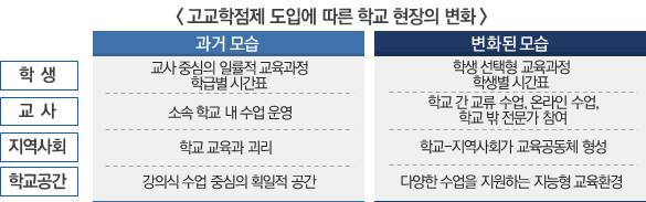 이러한 2022 개정 교육과정으로의 전환을 통해 고교학점제 도입이 성공적으로 이루어진다면, 아래 표와 같이 고교학점제 도입에 따른 학교 현장의 변화를 기대해볼 수 있겠죠?