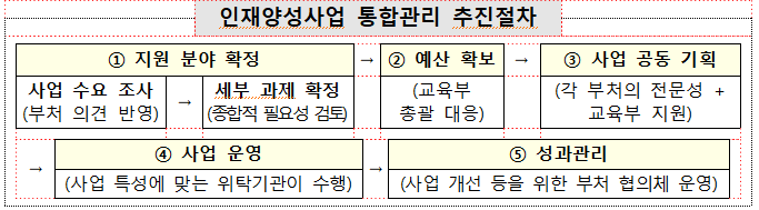 범부처 인재양성을 통합 관리하는 사업 틀*을 구축하여 사업의 효과성을 높이고, 통일된 인재양성 사업 규정을 마련하여 현장의 혼란을 완화한다.