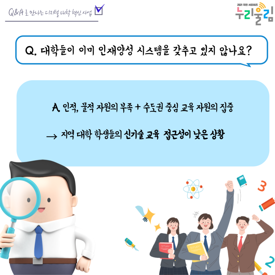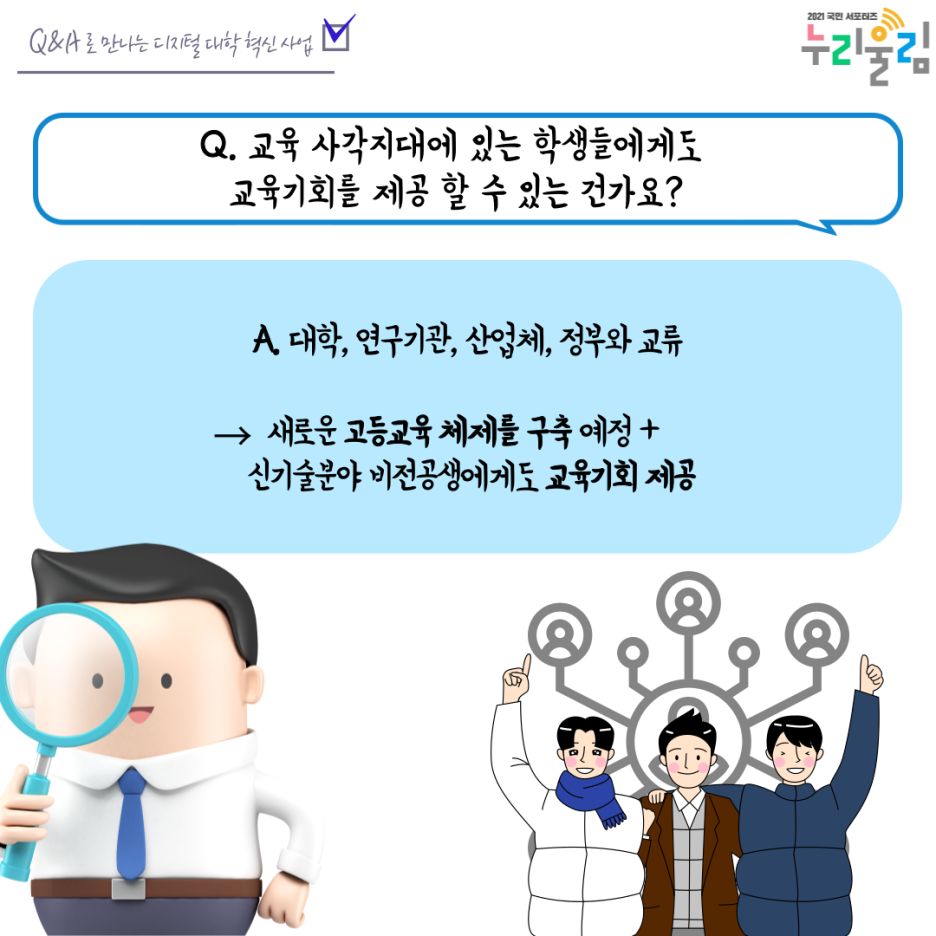 Q. 그럼 디지털 신기술 인재양성 혁신공유대학 사업으로 미래인재를 양성하는 거군요! 그럼 교육 사각지대에 있는 학생들에게도 교육기회를 제공할 수 있는 건가요?