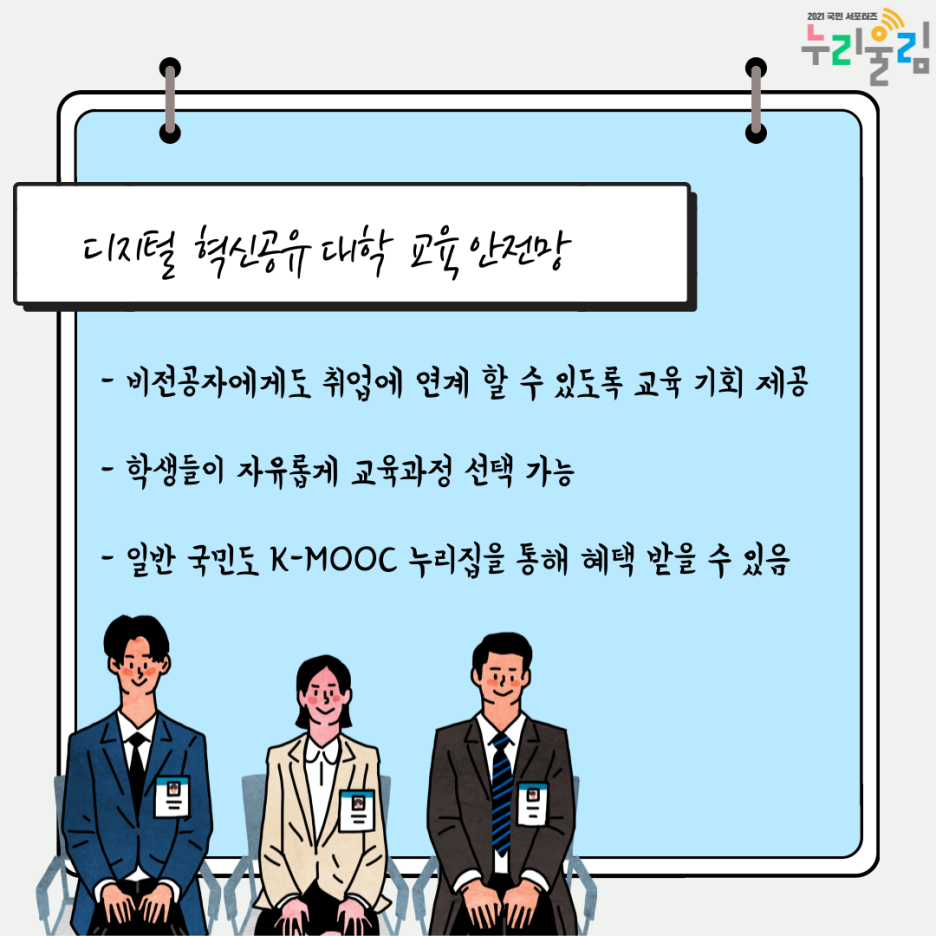 디지털 혁신공유대학은 전공자만 우대하는 것이 아닌, 희망학생에게 모두 교육기회를 충분하게 제공하는 것이 주목할 점입니다. 비전공자도 단기과정이 아니라, 취업으로 연계할 수 있도록 지원합니다. 또한, 대학 간의 상호작용을 활성화해 학생들이 교육과정을 자유롭게 선택할 수 있도록 할 예정이에요. 그렇다면, 사업에 참여하는 대학생만 이 사업에 혜택을 받을 수 있을까요? 그렇지 않습니다. 디지털 혁신공유대학은 일반 국민도 혜택을 받을 수 있도록 지원한답니다. 온라인 강좌를 한국형 온라인 공개강좌(K-MOOC) 누리집에 탑재해 사업에 참여하지 않는 대학의 학생과 일반 국민도 혜택을 받을 수 있다는 것이 주목할 점이랍니다.