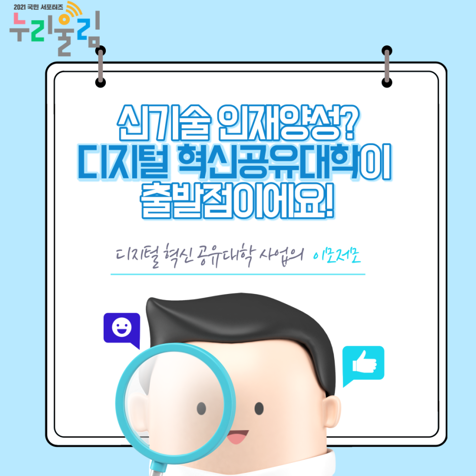 지금까지 디지털 혁신공유대학의 이모저모에 대해서 알아보았는데, 이제 어렵게만 느껴졌던 디지털 신기술 양성 혁신공유대학이 조금은 친근해지셨나요? 디지털 혁신공유대학 사업은 대학 간의 경쟁에서 공유와 협력에 초점을 맞추고 학생의 성장을 함께 지원한다는 점에서 의미 깊은 사업이랍니다. 아래 링크에 접속하시면 디지털 혁신공유대학 사업에 대해 더욱 구체적으로 알 수 있답니다. 앞으로 본격적으로 시작할 디지털 혁신공유대학 사업에 많은 관심 부탁드립니다!