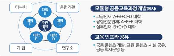 우선, 대학들이 보유하고 있는 첨단 기자재들이 모두 다른데요, 이러한 자원들을 공동으로 활용해야 합니다. 또한, 인공지능이나 지능형 로봇과 같은 첨단 분야 교육과 연구 방법을 가진 교원들, 관련된 기관들, 그리고 전문가가 참여합니다. 관련 기관들의 협력을 통해 신기술 분야별 인재양성 사업을 연계하고 함께 활용함으로써 지역 간, 대학 간 교육격차를 해소할 수 있습니다.