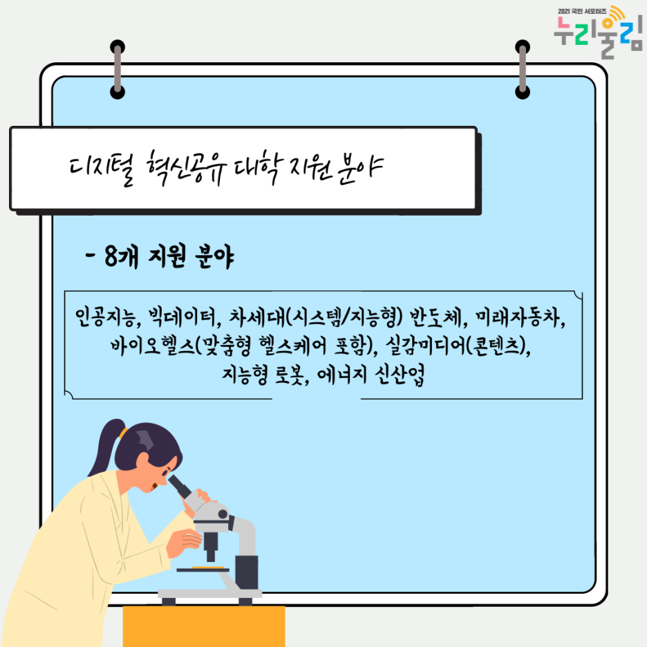 기술의 빠른 발전에 따라 다양한 신기술의 발전 또한 요구되고 있어요. 디지털 신기술 인재양성 혁신공유대학은 인공지능, 빅데이터, 차세대 반도체, 미래자동차, 바이오헬스, 실감미디어, 지능형 로봇, 에너지 신산업, 이렇게 8개 분야에 지원합니다. 참고로, 디지털 혁신공유대학의 지원 분야는 지원 필요성을 바탕으로 단계적으로 확대할 계획이라고 합니다.