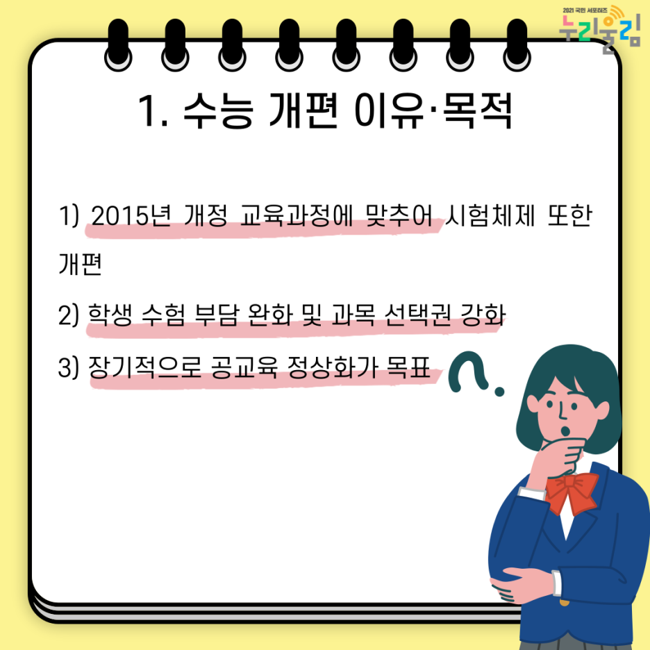 2015 개정 교육과정의 문·이과 통합 취지를 반영하여 수능 또한 이에 맞게 개편된 것이라고 합니다. 따라서 2015 개정 교육과정이 적용된 현 고등학생 3학년들이 응시하게 되는 올해 2022학년도 수능부터 새로운 시험 체제가 적용되는 것입니다. 더불어, 학생들의 진로나 적성, 흥미에 맞춰 과목을 선택하여 학습할 수 있도록 학생들의 과목 선택권을 강화하되 수험 부담은 줄이고자 했으며, 장기적으로는 대입 제도의 개편 등을 통해 공교육의 정상화가 목표라고 합니다.