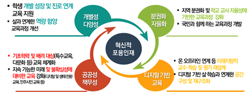 ※ △교육과정 재구성 자율성 범위 확대 등 수업 운영 다양화 △시도교육청 및 학교장 선택과목 활성화, 온오프라인 공동교육과정 활성화 등 학생 맞춤형 교육 강화 △에듀테크 활용 및 지역 연계 학교 밖 학습경험 인정 등