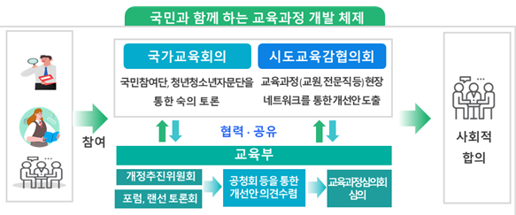 이를 위해 교육부, 국가교육회의, 전국시도교육감협의회는 협력적 거버넌스를 구축하고 다양한 의견 수렴 방식을 활용하여 교육과정 개정에 대한 현장의 목소리를 반영하는 데 협력하기로 하였다.