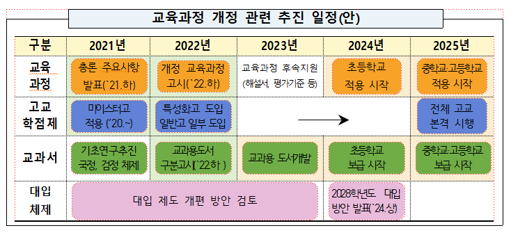 올해 하반기 중 2022 개정 교육과정 총론의 주요사항을 발표하고, 이와 연계하여 총론 및 각론의 시안을 개발하는 과정(2021.7.~2022.하)을 거쳐 교육과정 총론과 각론을 확정·고시(2022.하)할 예정이다.