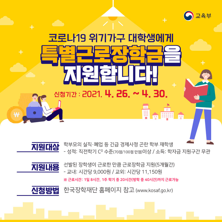 코로나19 위기가구 대학생에게 특별근로장학금을 지원합니다! 본문