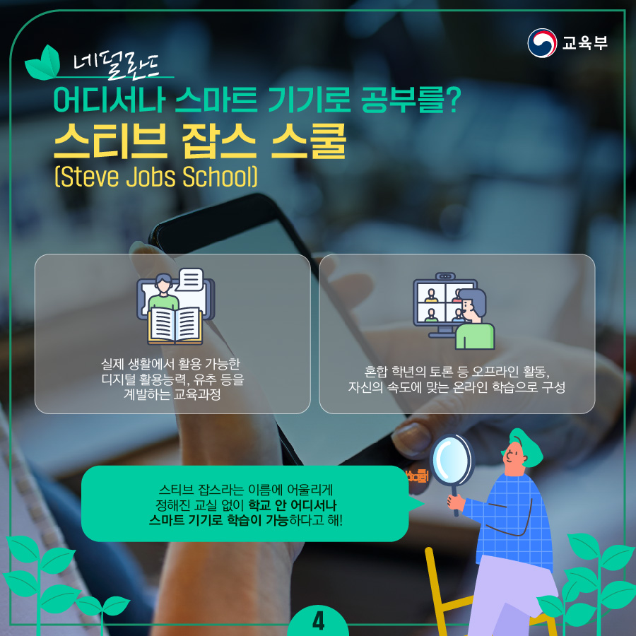 ✔ 🧒 : 스티브 잡스라는 이름에 어울리게 정해진 교실 없이 학교 안 어디서나 스마트 기기로 학습이 가능하다고 해!