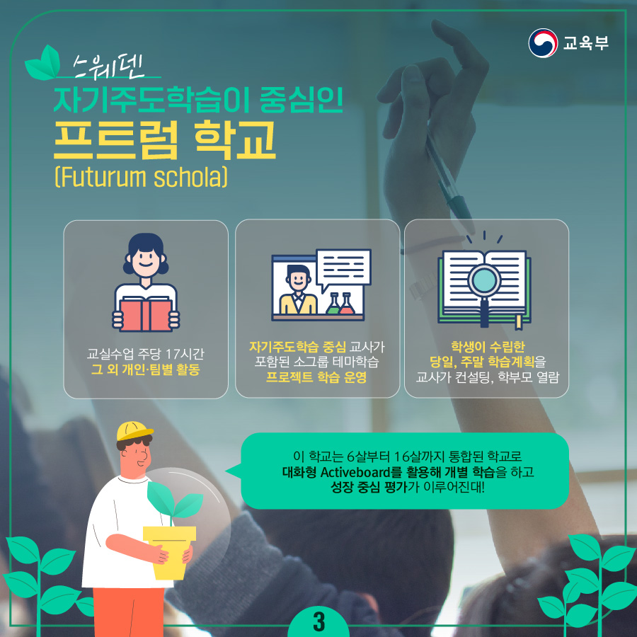 ✔ 👨 : 이 학교는 6살부터 16살까지 통합된 학교로 대화형 Activeboard를 활용해 개별 학습을 하고 성장 중심 평가가 이루어진대!