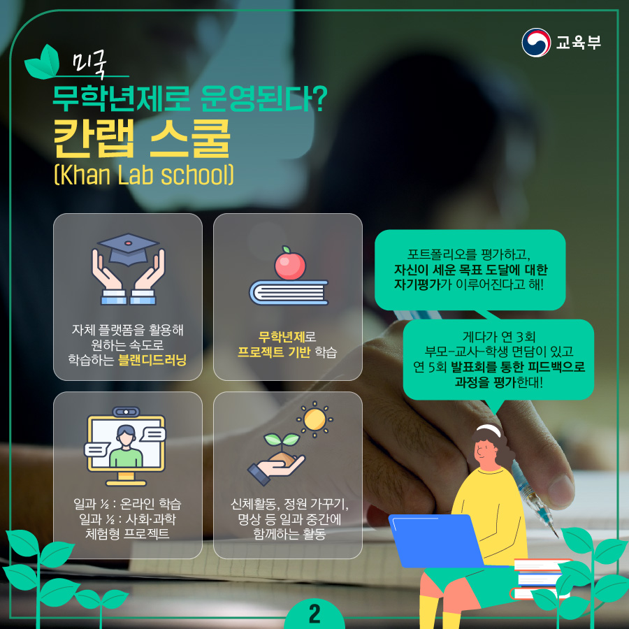 ✔ 👩 : 포트폴리오를 평가하고, 자신이 세운 목표 도달에 대한 자기평가가 이루어진다고해! 게다가 연 3회 부모-교사-학생 면담이 있고 연 5회 발표회를 통한 피드백으로 과정을 평가한대!