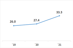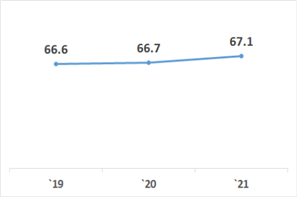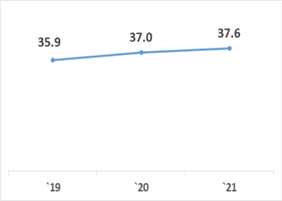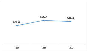 2019~2021 전임교원 강의 담당 비율 추이(%) |