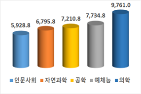 계열별 평균 등록금은 의학(9,761.0천원), 예체능(7,734.8천원), 공학(7,210.8천원), 자연과학(6,795.8천원), 인문사회(5,928.8천원) 순이다.
