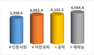 계열별 평균등록금은 예체능(6,564.4천원), 공학(6,142.2천원), 자연과학(6,062.9천원), 인문사회(5,398.6천원) 순이다.