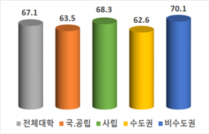소재지별*로는 비수도권 대학의 전임교원 강의 담당 비율이 70.1%로 수도권 대학(62.6%)보다 7.5%p 높았다.