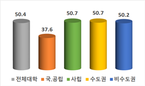 설립 유형별*로는 사립대학의 전임교원 강의 담당 비율이 50.7%로 국공립 대학(37.6%)보다 13.1%p 높았다.