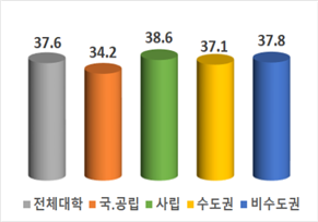설립 유형별*로는 사립대학의 소규모 강좌비율이 38.6%로 국공립대학(34.2%)보다 4.4%p 높았고, 소재지별**로는 비수도권 대학의 소규모 강좌비율이 37.8%로 수도권 대학(37.1%)보다 0.7%p 높았다.