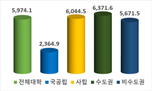 설립 유형별*로는 사립대학은 6,044.5천원, 국공립대학은 2,364.9천원이었으며, 소재지별**로는 수도권 대학은 6,371.6천원, 비수도권 대학은 5,671.5천원이다.