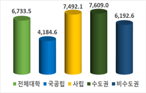 설립 유형별*로는 사립대학은 7,492.1천원, 국공립대학은 4,184.6천원이었으며, 소재지별**로는 수도권 대학은 7,609.0천원, 비수도권 대학은 6,192.6천원이다.