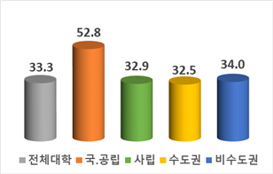 설립 유형별*로는 국공립대학의 소규모 강좌비율이 52.8%로 사립대학(32.9%)보다 19.9%p 높았고, 소재지별**로는 비수도권 대학의 소규모 강좌비율이 34.0%로 수도권 대학(32.5%)보다 1.5%p 높았다.