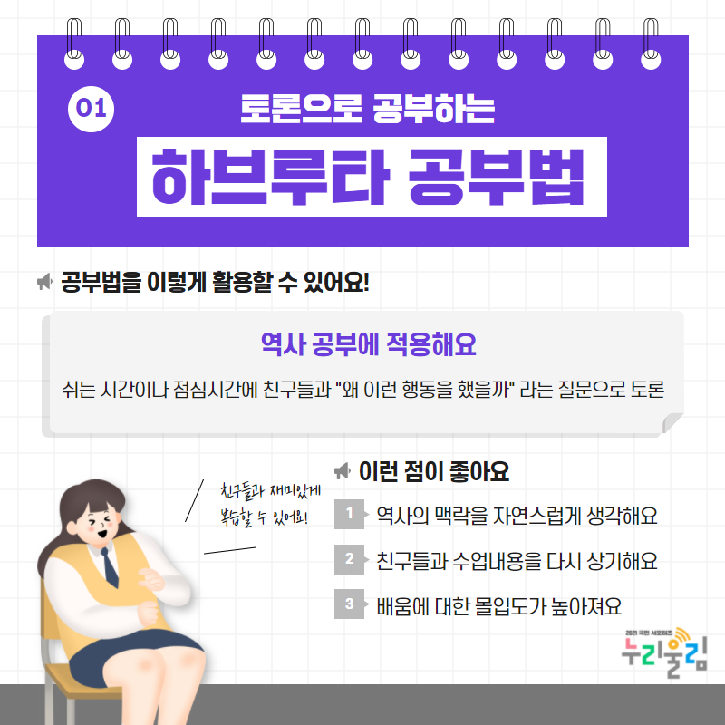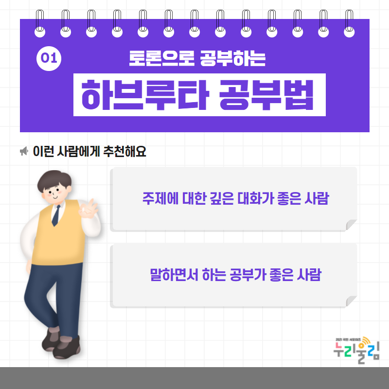 하브루타는 친구들과 수다 떨 듯이 이야기하는 것만으로도 ‘공부’가 된다는 것이 가장 큰 장점이라고 생각합니다. 따라서 하나의 주제에 대한 깊은 논쟁을 좋아하시는 분, 말하면서 공부하는 걸 좋아하시는 분께 하브루타 공부법을 추천해 드립니다.