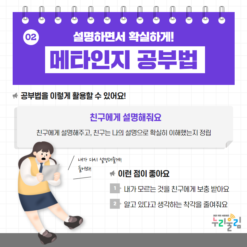 친구, 가족, 인형 다 좋습니다. 누군가를 앞에 두고 주제에 대한 설명을 해보세요! 아마도 머릿속에 정립되지 않은 것은 설명하기 힘들 것이고, 잘 이해가 된 내용은 술술 설명할 수 있을 것입니다. 설명하는 것을 통해 내가 모르는 것을 파악하고 이를 토대로 다시 공부한다면 메타인지를 100% 활용한 효율적인 공부를 하실 수 있습니다. 따라서 설명해 주는 것을 좋아하시는 분, 자신이 제대로 알고 있는지 확인이 필요하신 분께는 메타인지 공부법을 추천해 드립니다.