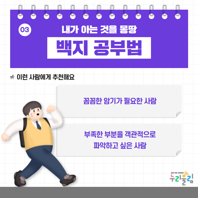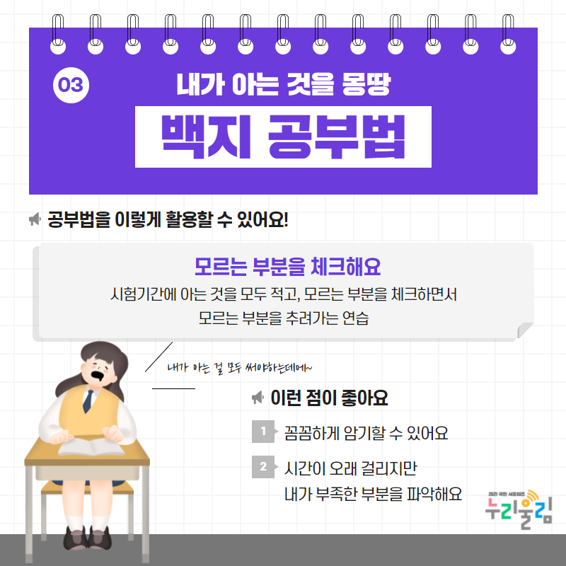 백지 공부법은 시간이 오래 걸린다는 단점이 있지만, 확실하게 아는 것과 모르는 것을 구분 지어줄 수 있기에 추천해 드리는 공부법입니다. 따라서 꼼꼼한 암기가 필요하신 분, 부족한 부분을 객관적으로 알고 싶으신 분께 백지 공부법을 추천드립니다.