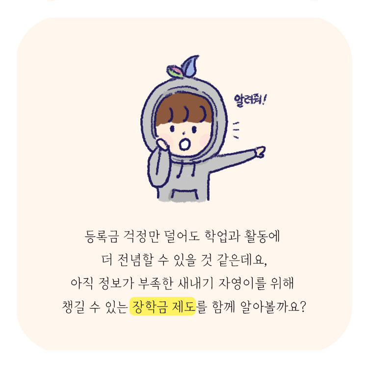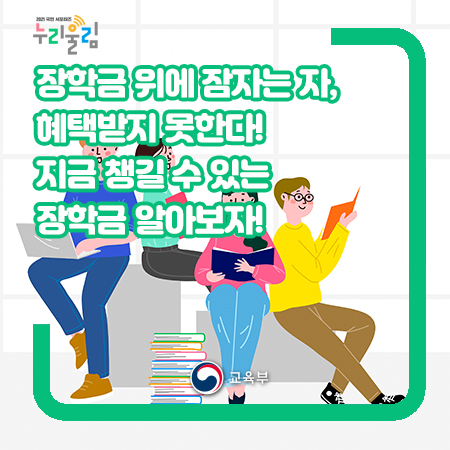 장학금은 찾는 만큼 보이는 법이에요. 한국장학재단뿐만 아니라, 각 학교에서도 운영하고 있는 다양한 장학금이 있으니 항상 정보를 찾아보고, 혹시나 잊고 있을 분들을 위해 교육부 국민 서포터즈 누리울림이 틈틈이 말씀드릴테니 교육부 블로그를 항상 주목해주세요!