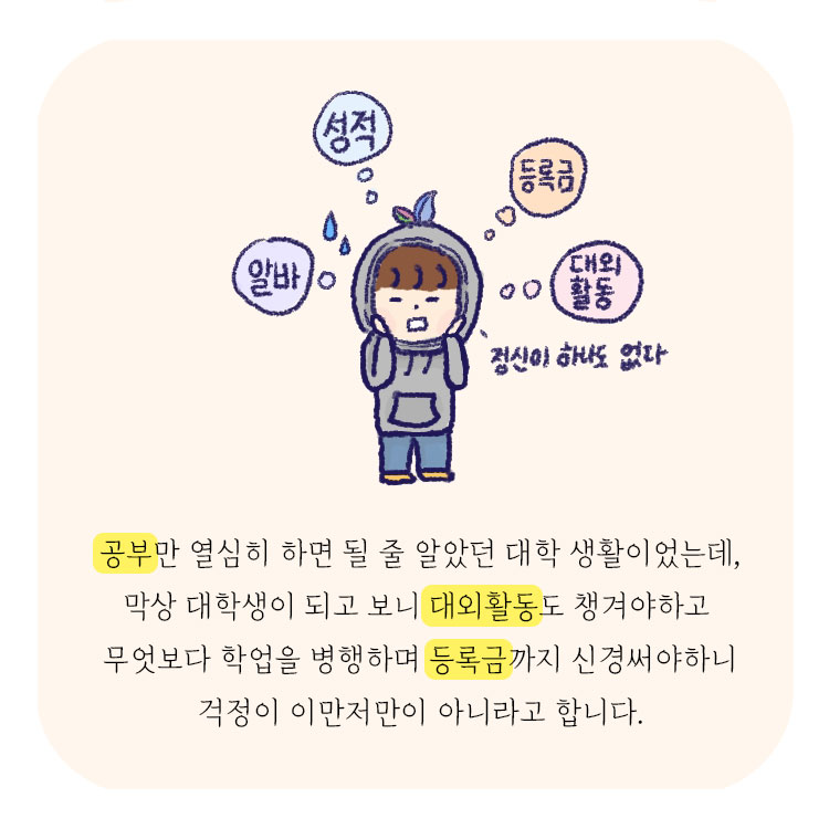 장학금에서 기본 중 기본이라고 할 수 있는 것이 바로 ‘국가장학금’ 이겠죠? 많은 학생들이 1학기 때 신청을 해봐서 알겠지만, 국가장학금은 소득 분위와 가정 상황을 고려해 경제적 어려움을 겪는 학생들에게 더 많은 혜택을 주는 소득연계 장학금입니다. 국가장학금은 학기별로 신청하기 때문에 1학기 때 신청한 학생들도 2학기 때 장학금을 받기 위해서 2학기 국가장학금 신청을 또 해야 합니다! 5월 중순 이후 한국장학재단 홈페이지나 모바일 앱을 통해서 신청할 수 있으며, 신청 직전 학기 성적도 심사 기준으로 들어가므로 성적 관리도 필수겠죠?