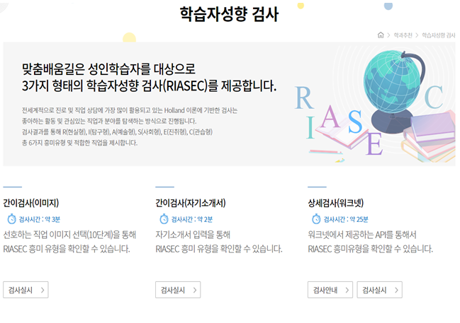 학습자 성향검사 서비스는 총 3가지 방식*으로 제공되며, 이용자는 세 가지 검사 중 하나를 자유롭게 선택하여 자신의 성향을 파악하고, 향후 학습방식과 학습목표 선택의 지표로 활용할 수 있다.