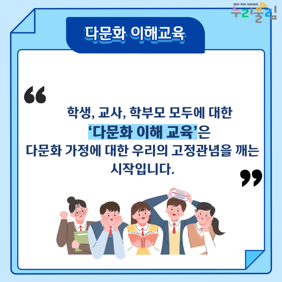 세계화 시대에 다양한 문화를 이해하고 공존하는 사회를 만들어 가기 위해서는 다문화에 대한 정보와 실제 경험할 수 있는 환경도 필요합니다. 따라서 학생, 교사, 학부모 모두에 대한 ‘다문화 이해 교육’은 다문화 가정에 대한 우리 사회의 고정관념을 깨는 시작이자 다문화 문화가 공존하는 사회의 시작이라고 할 수 있겠죠?