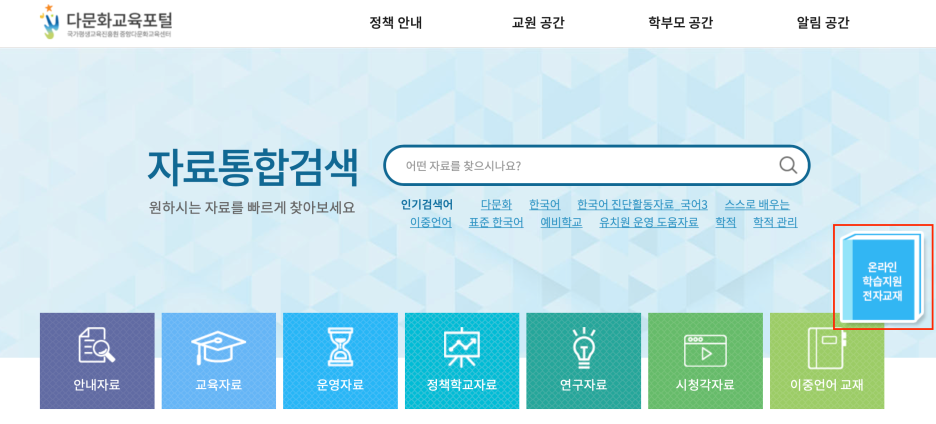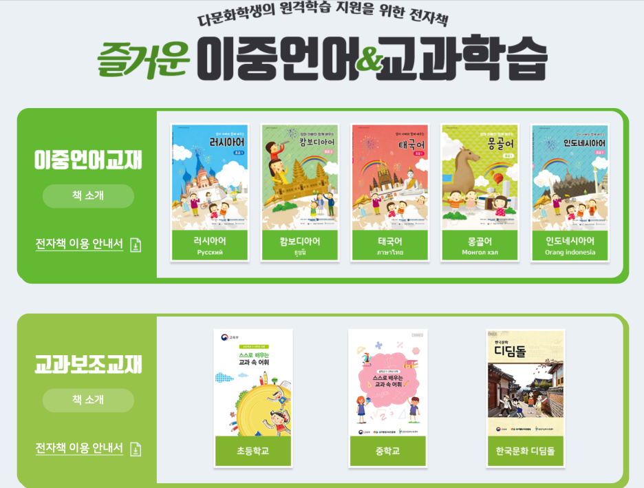 현재 체계적인 한국어 교육을 위해서 학습 콘텐츠 개발도 활발히 이뤄지고 있습니다, 교육부와 국가평생교육진흥원 중앙다문화교육센터에서 ‘스스로 배우는 교과 속 어휘’와 ‘한국문화 디딤돌’ 전자책을 제작해 보급하고 있습니다. 중앙다문화교육센터에 접속해 ‘학습 지원 전자 교재’ 배너를 클릭하면 학습 자료를 누구나 자유롭게 이용할 수 있는데요. 초등학교 과정 11권, 중학교 과정 6권으로 구성된 ‘스스로 배우는 교과 속 어휘’ 시리즈는 교과서에 배우는 어휘 개념을 쉽게 설명해 이해할 수 있도록 도와주는 교재이며, ‘한국문화 디딤돌’ 교재는 한국의 문화를 학습하도록 돕는 교재입니다. 이외에도 한국으로 이주해 온 초등학생, 중학생뿐 아니라 고등학생도 함께 공부할 수 있도록 만들고 있다고 합니다.