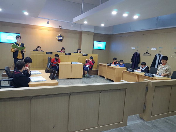 첫 번째로, 김해 대진초등학교가 있습니다. 김해 대진초등학교는 다문화 교육과 진로 교육을 융합한 체험중심 프로젝트 수업을 별도로 진행하고 있는데요. 대진초는 2017년 다문화, 새터민 가정 학생 27명을 대상으로 법사랑 위원과 함께하는 직업 체험활동을 실시했습니다. 이때 법과 관련된 직업에 대해 알아본 후에 직접 판사, 검사, 변호사, 방청객, 증인, 가해자, 피해자의 역할을 해보는 활동을 하는데요. 외부기관과 연계해 직업 체험활동을 기획함으로써 다문화, 새터민 학생들의 진로 설계를 돕고 있습니다.