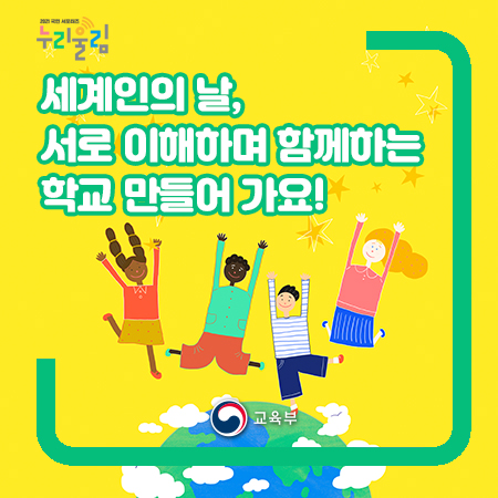 교육부는 우리 사회의 다문화 인식을 높이고 다문화 학생의 다양한 특성과 요구를 고려한 맞춤형 교육을 지원하겠다고 말했는데요. 세계인의 날인 오늘 학교에 모든 학생이 평화롭게 공존할 수 있도록 다문화 교육에 관심 가져보는 것은 어떨까요?
