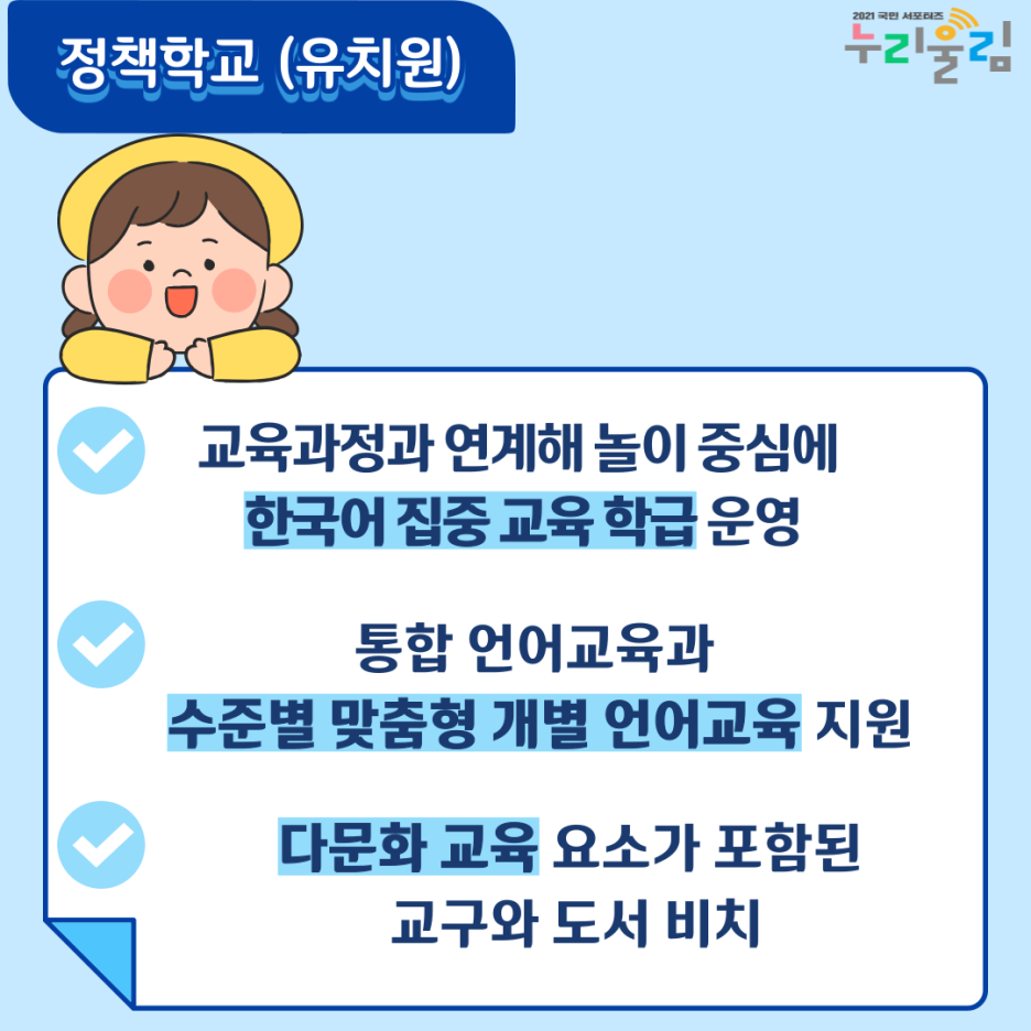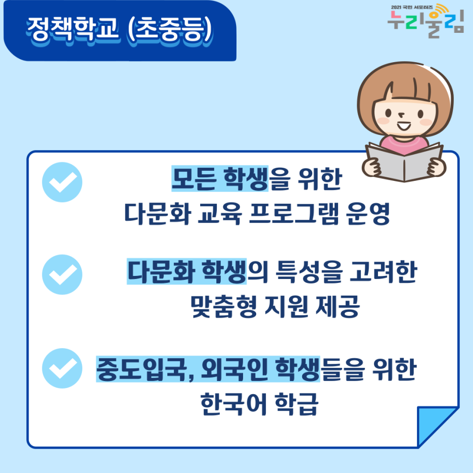 다문화 교육을 위한 학교가 있다는 사실, 알고 계시나요? 바로 수업 현장의 다문화 교육 참여를 활성화하고 언어발달, 한국어 교육 등 다문화 학생의 특성을 고려한 맞춤형 지원을 제공하는 학교인 ‘다문화교육 정책학교’인데요! 중도입국 학생, 외국인 학생을 대상으로 특수학급을 별도로 두면서 한국어 집중 교육을 지원하거나 일반 수업 내 지속성 있게 다문화 교육을 시행하는 방식으로 운영됩니다. 특수학급인 한국어 학급을 두는 경우 한국어 교육 수요 등을 반영해 중도입국 외국인 학생이 다수 재학하는 학교가 우선 지원 대상이라고 합니다.