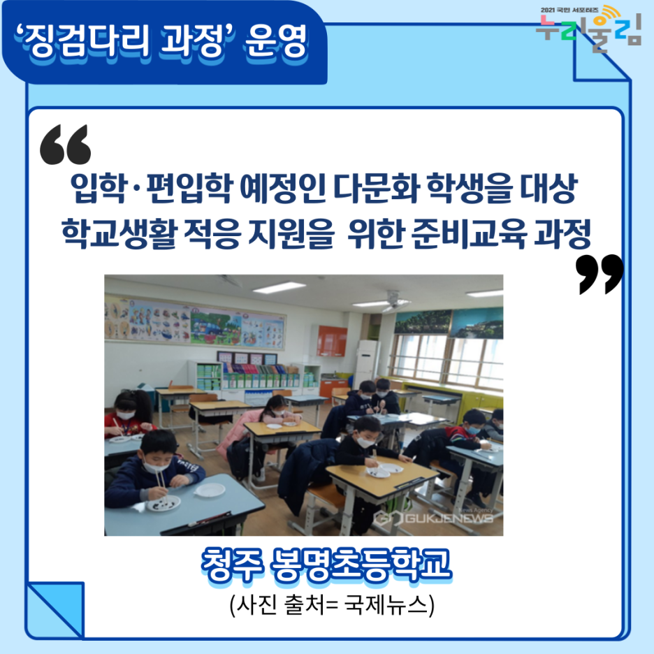 ‘징검다리 과정’을 진행하는 학교의 예시로 충북 청주 봉명초등학교가 있습니다. 올해 1월 18일부터 22일까지 5일간 다문화 가정 예비 1학년을 대상으로 징검다리 과정을 운영했는데요. 징검다리 과정을 통해 다문화 학생들은 학교 규칙 배우기, 친구와 관계 맺기, 가방 챙기기, 시간표 보는 방법 알기, 학교시설 둘러보기 등의 교육 활동에 참여했습니다. 다문화 가정 학생들은 문화적 배경 차이로 학교생활 정보가 부족할 수밖에 없었죠. 하지만 징검다리 과정을 통해 공정한 출발 선상에서 학교생활에 참여할 수 있도록 학교와 교육부가 함께 나서면서 다문화 학생들도 다양한 교육 활동에 참여할 수 있게 되었습니다.